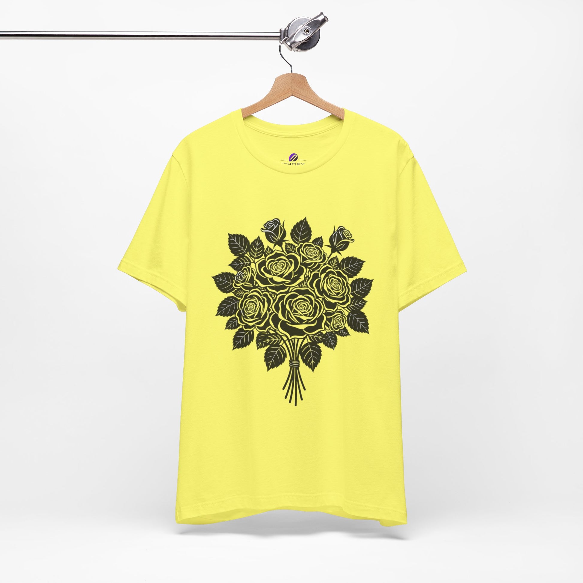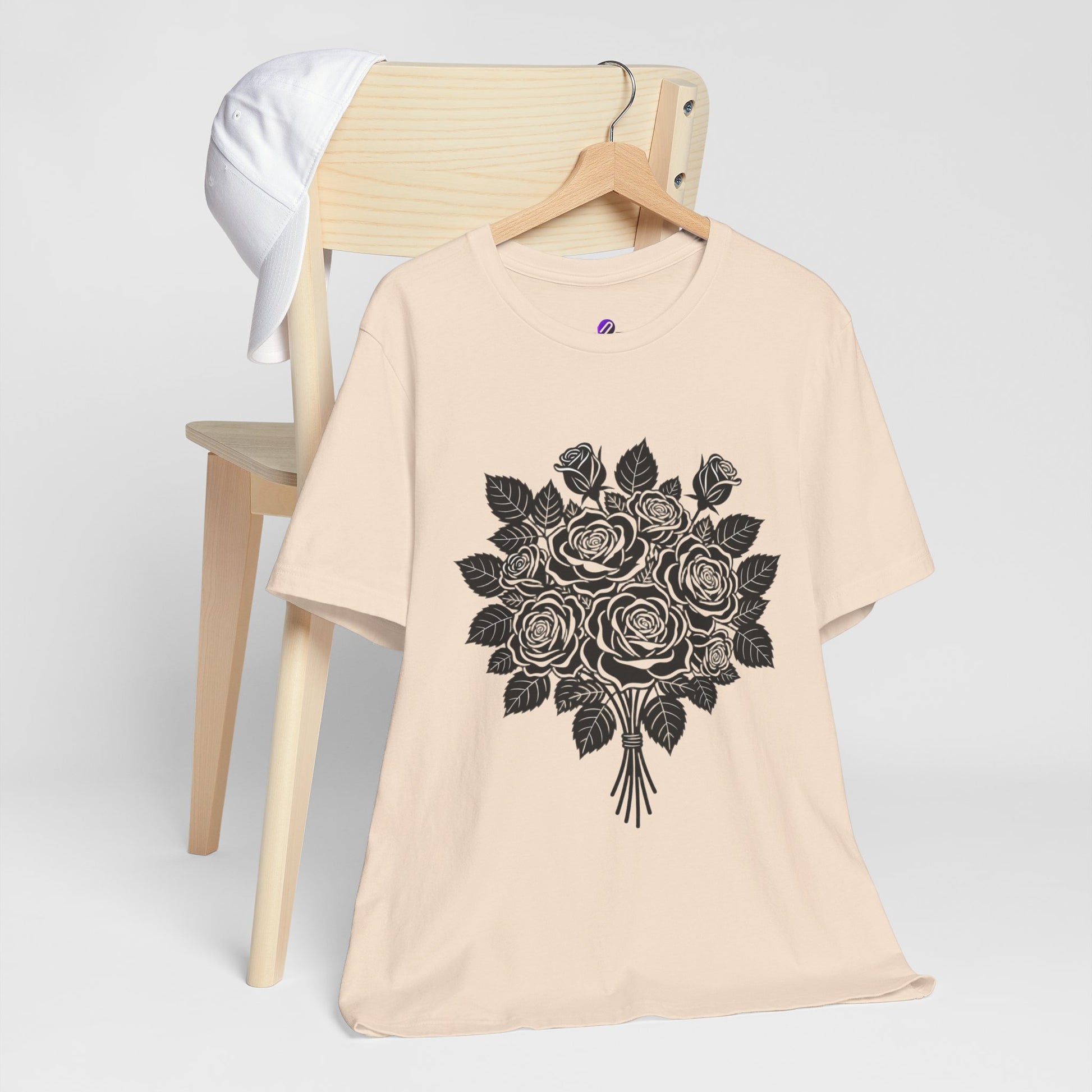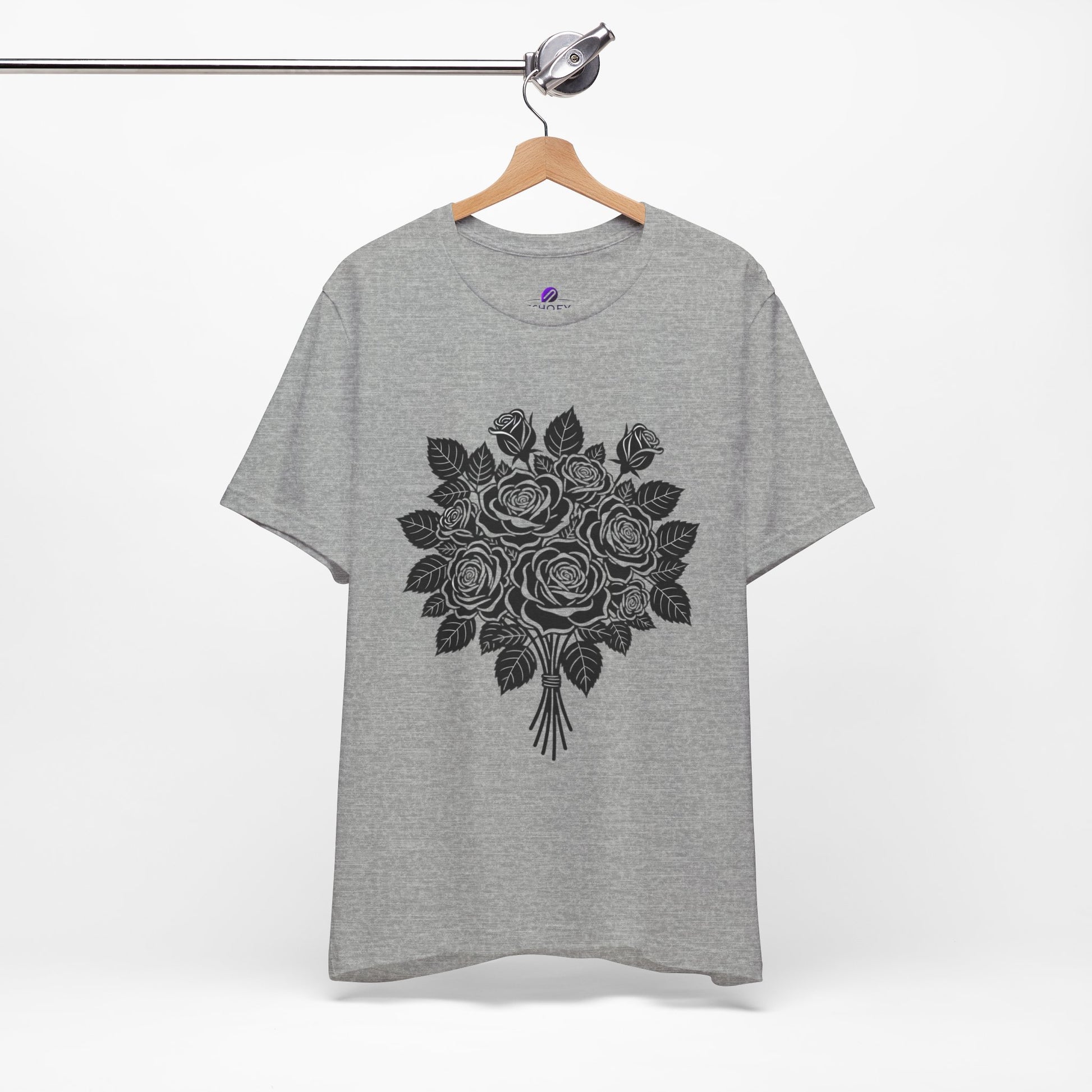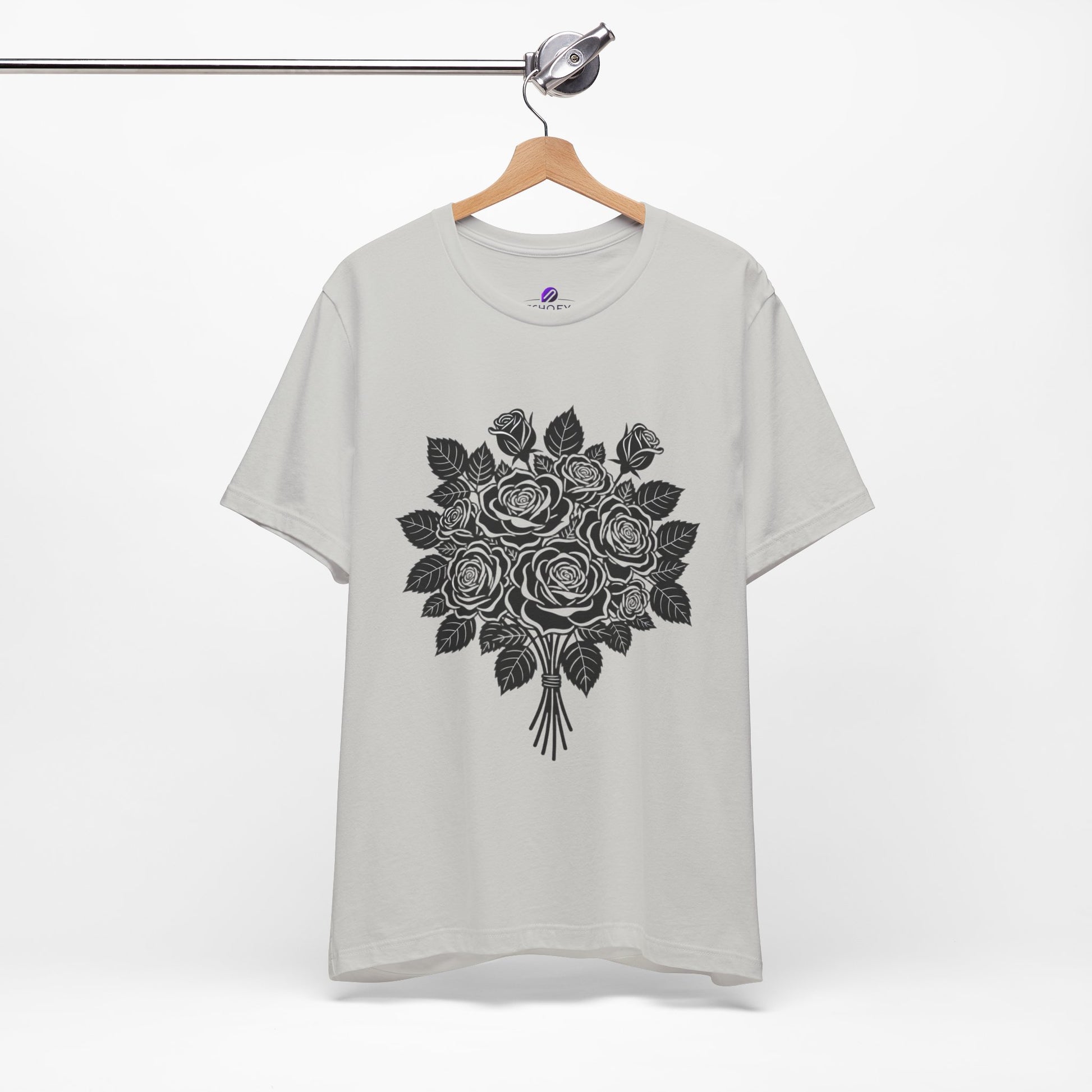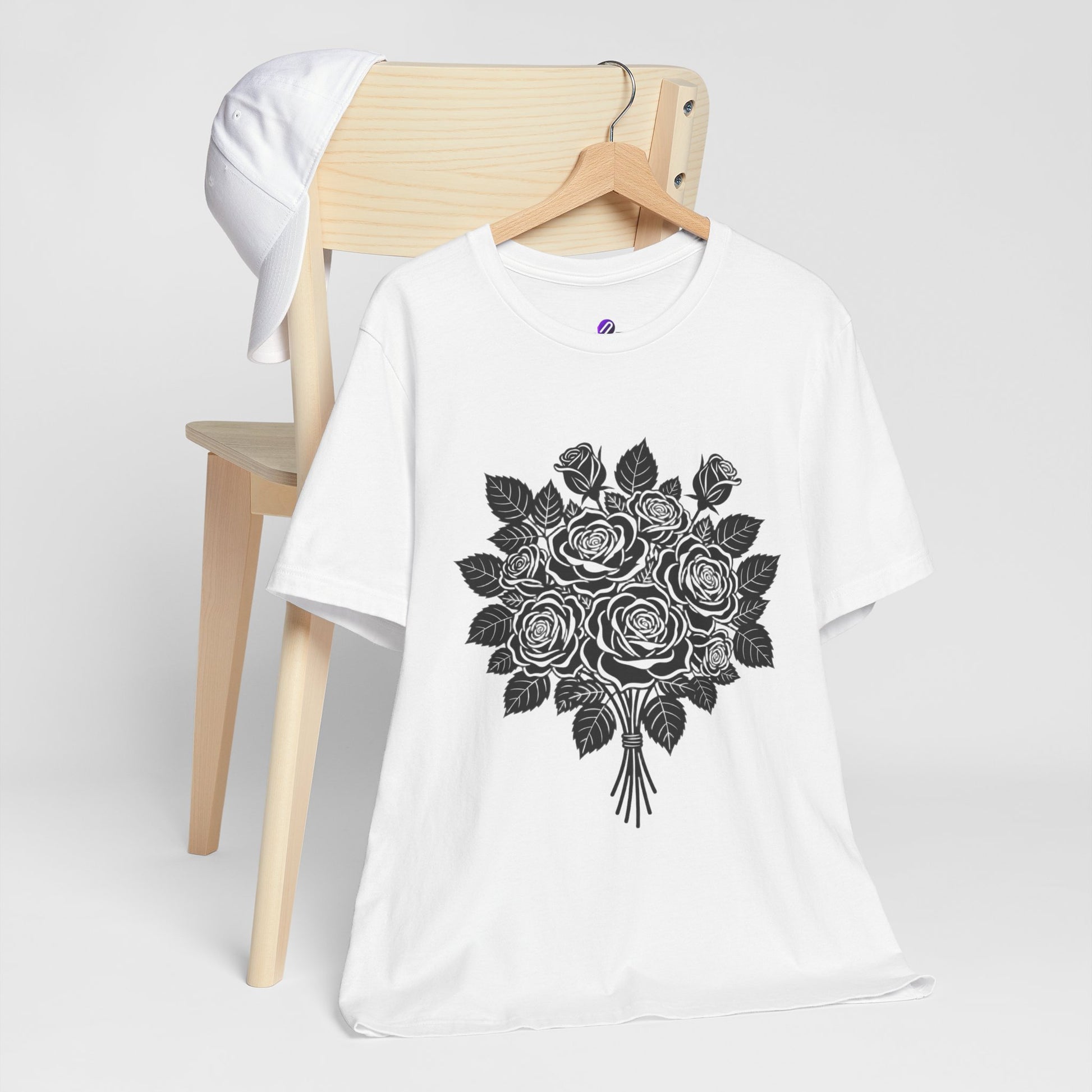 A soft, breathable cotton tee printed with a hand-inked bouquet of roses in rich monochrome. The floral artwork sits center-front like a small talisman — detailed petals and textured leaves that read like a sketchbook study. Light and airy on the skin, the shirt wears like a favorite companion for slow mornings, art walks, or layering under a jacket for an evening out. It’s subtle but expressive: floral without being fussy, wearable art that brings a quiet, thoughtful edge to everyday outfits.