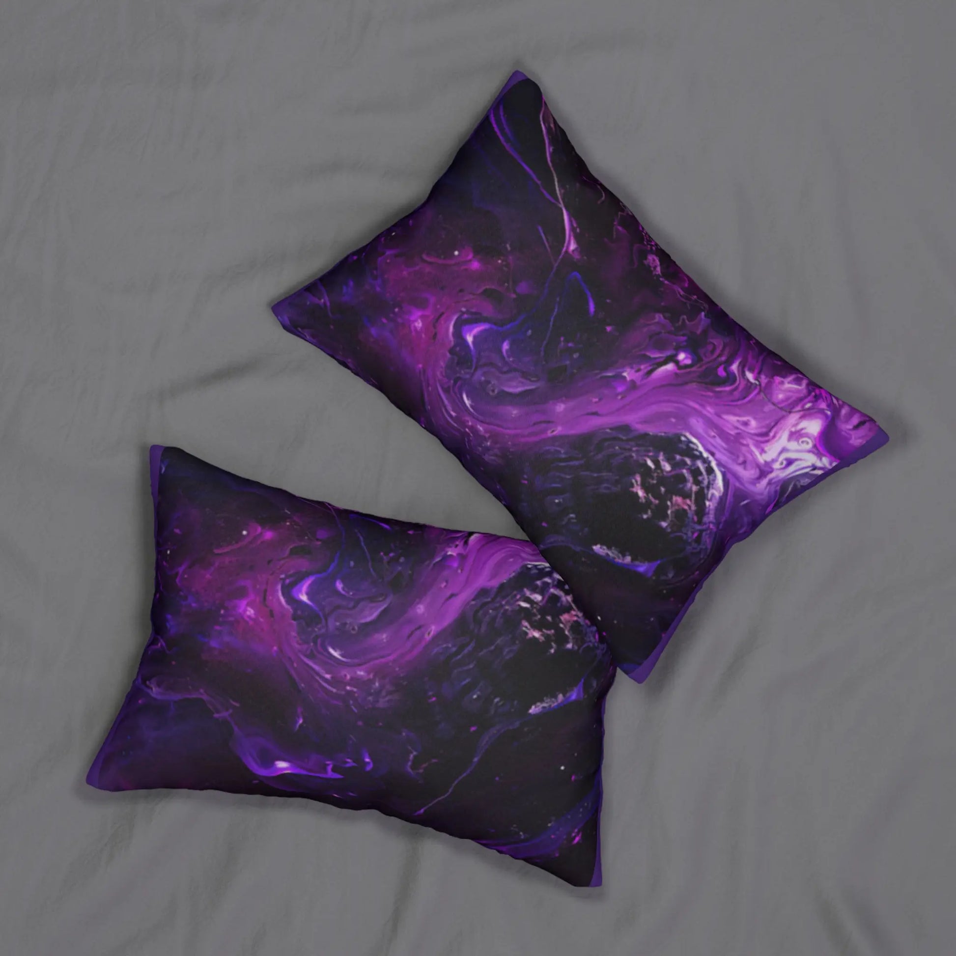 A sculpted lumbar pillow that brings midnight skies and swirling galaxies to your favorite chair. The rich purples and inky blacks form a fluid, cosmic scene that invites quiet moments—reading under a lamp, sinking into a couch after a long day, or adding a moody accent to a bedroom. The shape supports the small of the back while the plush recycled polyester fill keeps form and comfort. The concealed zipper keeps the look seamless, and the double-sided print ensures the design reads beautifully from every angle. It fits naturally into a nook for slow mornings, a stargazer’s living room, or a creative studio that leans into bold, atmospheric color.
